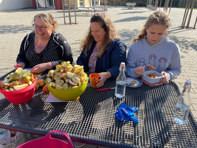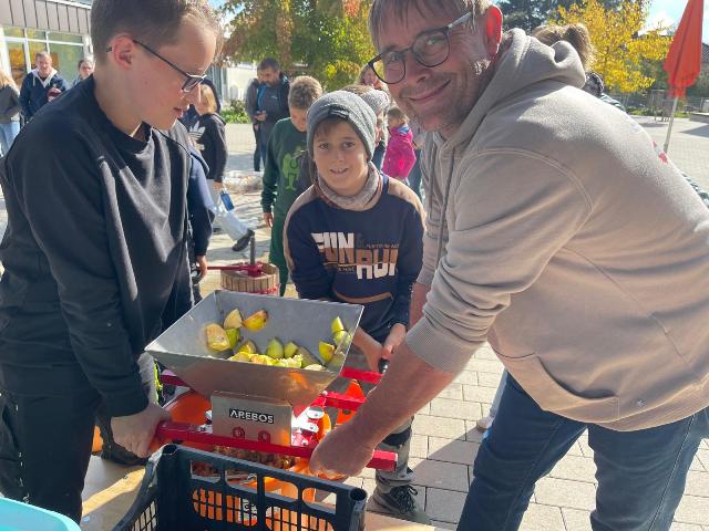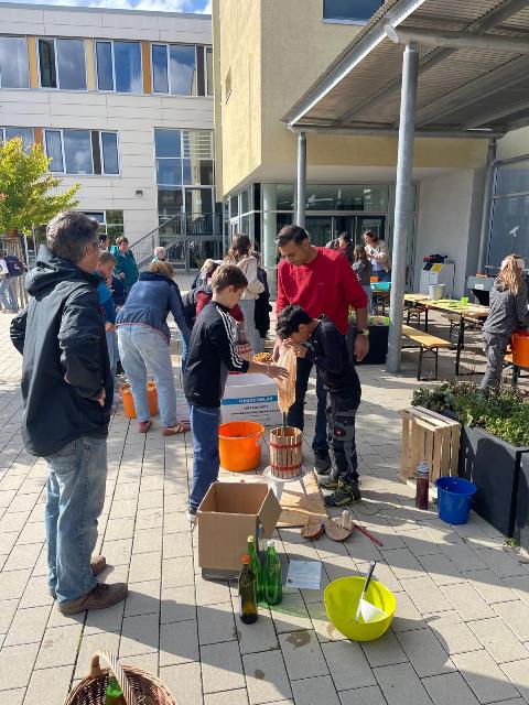 Zum zweiten Mal fand an unserer Schule wieder eine Mostpressaktion in unserem Pausenhof statt, die zur Apfelerntezeit von den Umweltklassen organisiert wurde. An insgesamt drei Mostpressen, die mit einer Handspindel angetrieben werden können, durften alle interessierten Eltern und Kinder auch in diesem Schuljahr wieder selbst geerntete und mitgebrachte Äpfel in leckeren Apfelsaft verwandeln, der entweder mit nach Hause genommen oder direkt an Ort und Stelle verkostet werden konnte. Die Herstellung selbst gepressten Süßmosts erfolgt in mehreren Arbeitsgängen. Zunächst werden die mitgebrachten Äpfel gewaschen, bei Bedarf mit einem Küchenmesser ausgeschnitten und halbiert und dann in den Maischer gegeben, der die Äpfel im Handbetrieb in kleine Stückchen zerkleinert. Die werden anschließend in den Maischesack der Obstpresse gefüllt, mit passenden Holzzulagen abgedeckt und dann ausgepresst. Der Apfelsaft fließt in ein Sammelgefäß und kann abgefüllt werden, übrig bleibt der ausgepresste Apfeltreber oder –trester, der entweder als Tierfutter verwertet oder kompostiert werden kann. Weil der ganze Vorgang Zeit und vollen Körpereinsatz erfordert, gab es zur Stärkung selbst gemachten Kuchen, Kaffee und natürlich frisch gepressten Apfelsüßmost, der in dieser Qualität nicht überall zu finden ist.
