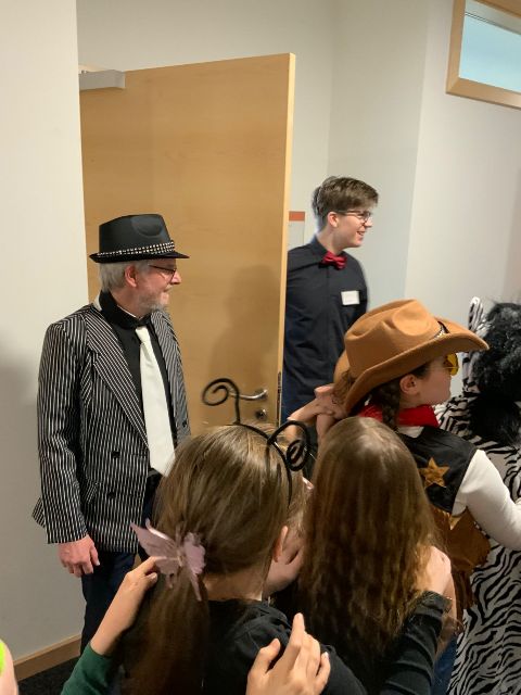 Um 14 Uhr eröffnete der erste Schülersprecher, Michael Heinrich, als Kaiser verkleidet die Faschingsparty. Kurz darauf hatte die Tanz-AG (Leitung Frau Glöggler-Roller) ihren Auftritt „Minion Alarm“. Danach durften alle auf die Tanzbühne – für die richtige Beleuchtung inklusive Nebelmaschine sorgte die Technik-AG (Leitung Herr Stadelmann). Zwischendurch wurden immer wieder Spiele gespielt und es gab eine Polonaise durch’s Schulhaus bis in den ersten Stock, wo der Schulleiter, Herr Lang, abgeholt wurde. Höhepunkt war der Kostümwettbewerb, bei dem ein Junge, der als Cheerleaderin verkleidet war, gewann. Platz 2 und 3 gingen an zwei Teufel und eine Herzkönigin.