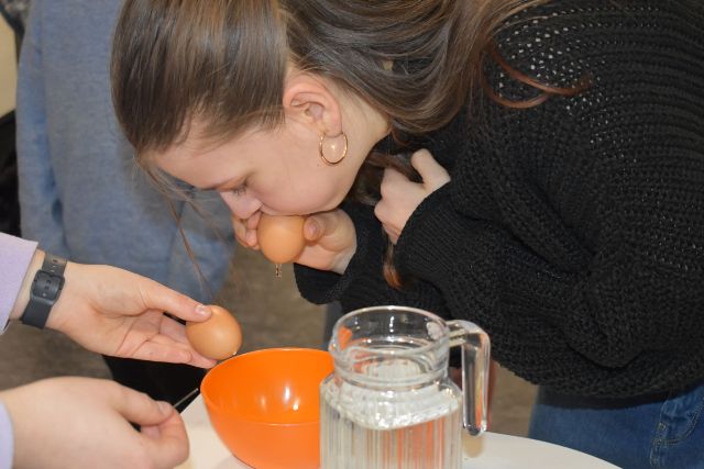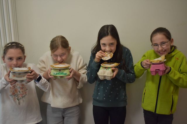 In der Schulküche wurde zunächst vorsichtig gepustet statt gekocht: Die Eier wurden ausgeblasen und für weitere kreative Projekte vorbereitet. Anschließend ging es an die Pfannen – und der Duft von frisch gebackenen Pancakes erfüllte den Raum. Mit viel Freude wurden die kleinen Leckereien selbst zubereitet und natürlich auch direkt probiert.