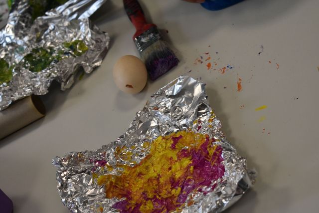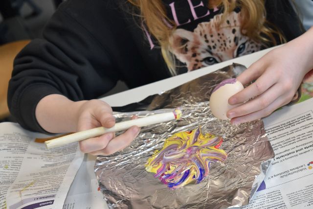An dieser Station war noch einmal richtig Kreativität gefragt. Mit Farbe, Alufolie und jeder Menge Einfallsreichtum verwandelten die Schülerinnen und Schüler schlichte Eier in bunte, fantasievolle Kunstwerke – jedes mit seinem ganz eigenen Muster und Charme.
